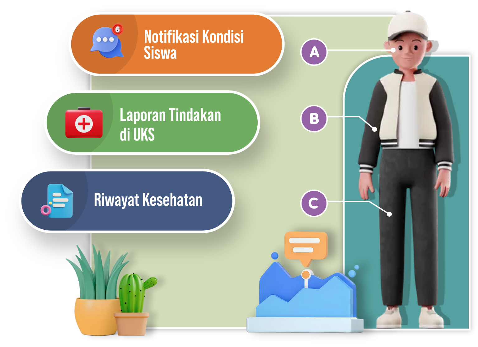 Laporan siswa yang sakit di sekolah melalui UKS akan dilaporkan kepada wali siswa dengan notifikasi ke HP wali.